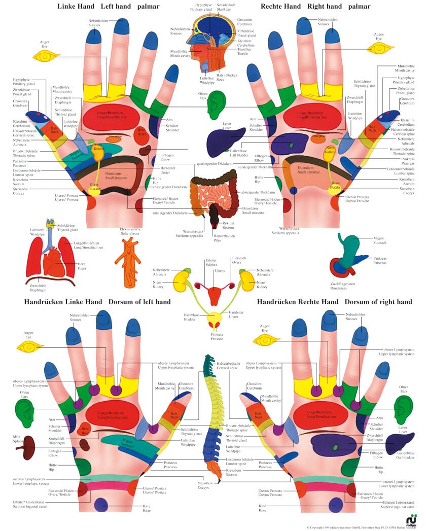 Organe der Körpervorderseite, wie Nase, Magen oder andere Bauchorgane, haben ihre Reflexzonen auf der Handoberseite, während rückwärtige Körperbereiche, wie Nacken oder Rücken, auf den Handflächen abgebildet sind. Gelenke und innere Organe können generell an beiden Seiten vertreten sein.